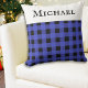 A stylish pillow for a bed, chair or sofa, patterned with a buffalo plaid design in blue and black. At the top is a white band, with your chosen name in black capital lettering. The buffalo check cushion makes an elegant custom gift for friends, family and colleagues, at Christmas and all year round.