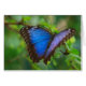 A stunning Blue Morpho Butterfly at rest on a green leafy branch.