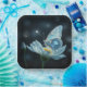 A close-up of a glowing blue butterfly with moon and stars reflected in wings on a moonflower