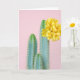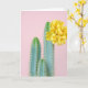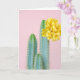 This trio of blue cactus sits on a pink background with a yellow flower.