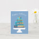 Send stylish birthday wishes with this modern greeting card featuring a beautifully illustrated three-tiered cake on a crisp white cake stand. The cake design showcases rich blues, aquas, and golden tones with artistic detailing, all set against a soft blue background. The white “Happy Birthday!” script adds an elegant finishing touch to the front of the card.