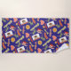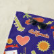 This colourful beach towel with images of the state of California will brighten up any beach or swimming pool. Images include a trolley car, a Oscar statue image, an orange sun, the outline of the state, a red sports car, a pink heart, text that says California and Golden State, the state flag with the traditional bear image, and palm trees! Predominant colours are orange, lime green, and gold, all placed on a dark blue background. Be sure to see the matching products in our store. *Clip art used in this design is copyrighted by Encore Software, Inc., which permits use to its licensors. All rights reserved.
