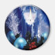 Blue holiday candle centerpiece with ornaments and holly magnet
