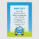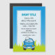 Smiling blue cartoon car with soap bubbles over green grass under blue sky.
