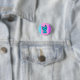 A button printed with a cute blue kitten on a pink, blue and purple colour block background.