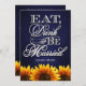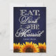 Eat Drink & Be Married Blue Chalkboard Sunflower Wedding Invitations---match the RSVP cards and more found below on this page. Compliment your sunflower wedding theme with these invitations that feature a blue chalkboard texture as a background with Eat, Drink & Be Married in elegant script with vibrant sunflowers at the bottom of the front and back of each invitation. These wedding invitations are set to high quality basic card stock; however, you can change the stock to linen, felt (embossed), recycled, and several metallic shades if you would like under number 2 (choose your style, size & paper type) below the orange add to cart button. A list of the additional costs for a fancier card stock are displayed also under that option. Each invitation comes with a fitted white envelope. See matching wedding RSVP cards below to complete the suite.