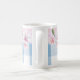 A cheery pink and blue watercolor charmer mug, printed with painted big sky blue and white checks and a mauve and blue colour wash, trimmed with a wide band of moth orchids.
