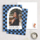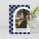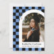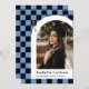 This modern and unique graduation announcement features a periwinkle blue and black chequered background highlighting a photograph of the graduate framed in a white arch with the graduate's name and school beneath. A small gradation cap is cleverly displayed in the checked background with the graduate's graduation year. The back has a fun matching checked pattern in blue and black.