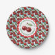 A watercolor ai illustration pattern of retro red cherries, sage green foliage and blue chequered plaid personalised birthday paper plates.