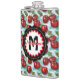A watercolor ai illustration pattern of retro red cherries, sage green foliage and blue chequered plaid personalised Flask .