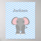 A modern blue chevron pattern and cute elephant illustration is featured on this personalised nursery wall art poster. Easily personalise with your child's name! Perfect for a baby boy nursery or toddler room. Custom colours available upon request.