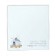 Forty sheet notepad with blue chicken coop design. Add text to the bottom. Sample is name and address in a fun, printed font style. The design is in the bottom left corner, with chickens, rooster, birds and wildflowers by a light blue coop.