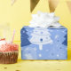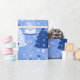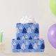 Blue and white Christmas trees with winter snow globes and snowflakes.