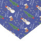 This is a colourful and fun table runner which features a pattern of Holiday images on a bright blue background. The images include a snowman with a hat and striped scarf, a green Holiday tree, a striped Christmas stocking, snowflakes, and the text in white "Merry Christmas!" and "Happy New Year!" Brighten your table for the Holiday season!