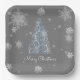 Elevate your holiday gatherings with this Blue Christmas Tree and Snowflakes Paper Plates, a stylish addition to your festive table. These sturdy plates feature a festive design with a radiant Christmas tree and white snowflakes, accented by fancy flourishes and falling snow against a sophisticated grey background. The elegant script displaying "Merry Christmas" adds a touch of holiday cheer. Perfect for serving treats, these plates combine functionality and charm to enhance your seasonal celebrations with a refined, wintry vibe.