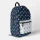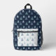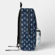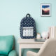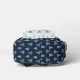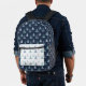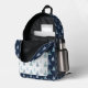 The colour palette is kept muted, emphasising natural tones. The backpack has a contrasting pocket in white colour, while the rest is in dark blue subtle background. This simple yet elegant pattern brings a sense of calm and nature-inspired beauty to any setting.