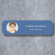 A Minimalist Name Tag with a circle photo frame for employee company or small business with name and job or service, all on a blue background. You can also add your own logo instead of the photo!