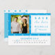 Save the date postcard with light blue circles and a blue background. Customise the postcard with your month and circle the day. You can see more designs on my website: www.darmanddesigns.com