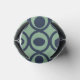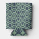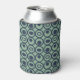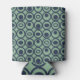 This can cooler has a geometric design of circles in rows with circles or ovals inside in blue on a field of green.