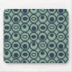 This mouse pad has a geometric design of circles in rows with circles or ovals inside in blue on a field of green.