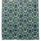 This shower curtain has a geometric design of circles in rows with circles or ovals inside in blue on a field of green.
