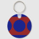 This bold geometric pattern features a blue circle in the centre and two blue half circles on the edges of a red background.