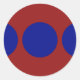 This bold geometric pattern features a blue circle in the centre and two blue half circles on the edges of a red background.