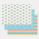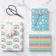 Lucky one birthday wrapping paper sheets with green four leaf clovers and a sparkling rainbow in pretty colours. St Patrick's Day themed first birthday party wrapping paper sheets in blue with a four leaf clover pattern, rainbow stripes, and a lucky one pattern. Colourful blue lucky one birthday party wrapping paper sheets with mixed patterns.
