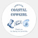 Get ready to celebrate the bride-to-be with our Coastal Cowgirl bachelorette party classic round sticker! The charm of the ocean meets the spirit of the wild west with coastal and western motifs. Perfect for a Tropical Beach Ocean theme or a Western Girl Last Rodeo bash. Whether she's a Coastal Girl or loves Blue Coastal Vibes, this thank you sticker has it all. Featuring Blue Western Yeehaw Boots and seashell motif, it's ideal for any Blue Aesthetic Fun Party. From New Orleans to Nashville, Miami to Charleston, and even Texas and Tennessee, this classic round sticker captures the essence of fun and adventure. Make her last fling unforgettable with this unique and vibrant sticker!