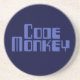 Code Monkey - dark blue sandstone coaster with light blue digital style lettering.