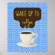 This poster features a hot cup of coffee against a backdrop of charming blue traditional mosaic tiles. The timeless design exudes warmth and cosiness, making it a stylish addition to your kitchen, dining room, breakfast counter, coffee nook, or even office pantries. The simple yet powerful slogan, "Wake up to coffee" resonates with coffee enthusiasts, inspiring a refreshing start to the day.