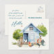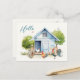 Postcard with chicken coop and optional printed message and address. Large "hello" text on the front is printed in the upper left corner over a cute, blue chicken coop design. Summer green trees poke from behind the chicken's house, with chickens and rooster in the yard.Perfect for keeping in touch with friends, customise with a personal message on the back. Also add a mailing address to the template provided, or delete the sample wording to order blank.