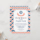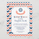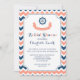 Nautical theme bridal shower invitations in modern dark navy blue, peach orange pink and white chevron stripes pattern with ship wheel and fun banner.