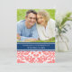 Elegant wedding vow renewal custom photo template invitations in chic and elegant dark navy blue, peach orange pink and white classic vintage damask floral pattern with fully customisable text to include your vow renewal ceremony details. Contact us for a custom colour.