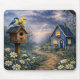 Add a touch of storybook charm to your workspace with this scenic mouse pad featuring two colourful birds perched on a rustic birdhouse beside a cosy blue cottage. White daisies, a winding stone path, and a hanging swing create a peaceful garden setting, while dramatic storm clouds and a flash of lightning add striking atmosphere in the distance. The blend of soft florals, cottage details, and moody sky gives this design a magical and slightly whimsical feel. Perfect for anyone who loves birds, cottagecore style, nature scenes, and charming countryside artwork.