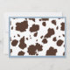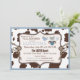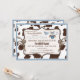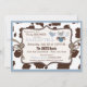Cow print with bandanna jumper, cowboy boot socks, and diaper on clothesline baby shower invitation card design in blues and browns.