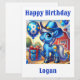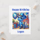 A fun blue cowboy pony is celebrating his 8th birthday with a blue balloon with the number 8 and a blue cowboy hat on a farm. Personalise the card with your child's name.