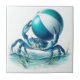 This ceramic tile is shown with a blue crab holding a beach ball art print.