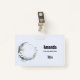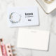 Name tag with a mystical illustration. A dark blue crescent moon with a elegant thin circle outline and white flower blossoms along its edges.