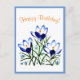 This post card displays an image of three blue crocuses on white background.  The original image was painted by W.B. with acrylic paint.