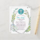 This charming First Holy Communion invitation postcard features a beautiful turquoise blue cross with pretty Spring botanical leaves and blue flowers in a sweet geometric frame. It's perfect for inviting friends and family to your son or daughter's 1st Communion.