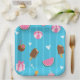 The paper plates designed for a kid's birthday party feature a charming combination of a blue background adorned with adorable pink illustrations. These illustrations likely include playful motifs such as cartoon animals, balloons, or other child-friendly designs. This aesthetic not only appeals to children but also creates a festive and joyful atmosphere suitable for celebratory occasions. The design choice of blue and pink ensures a vibrant and cheerful look, enhancing the overall theme and décor of the party. These paper plates are both practical and decorative, serving as essential items that contribute to the celebratory ambiance of the event.