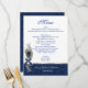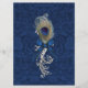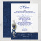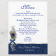 Elegant wedding table menu done in white, with a blue on blue damask and silver tone band, across the bottom. Graphics of a silver tone flourish with blue bow, peacock feather, and pearls, decorates the left bottom of the menu, with a larger version, on the backside of the menu. Personalise the blue and light grey text with your information. Lovely addition to our Blue Damask and Peacock Feather wedding set.