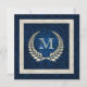 Pearl laurel wreath with pearl frame on a rich blue damask background.