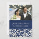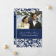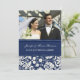 Marriage announcement photo cards in elegant dark navy blue and cream off white classic floral damask pattern, fully customisable with your names, wedding photo and wedding details, the perfect way to announce your wedding to friends and family. Available in a wide range of matching wedding products.