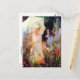 A fine art postcard with the painting by the American artist Charles Courtney Curran (1861-1942), titled Blue Delphiniums. A woman dressed in white with a parasol admiring the garden of blue and red flowers.