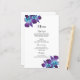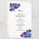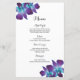 Purple and turquoise blue Dendrobium orchid wedding menu. Simple wedding menu design that features a beautiful orchid variety called a blue dendrobium. It is teal / turquoise in colour paired with violet and royal purple. A great flower choice for peacock wedding colour theme.