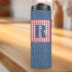 A blue denim print on this trendy 12oz thermal tumbler with red and white check frame and a large blue initial. Easily change initial with the Template provided. Stainless body, plastic lid. Vacuum-sealed double walled construction retains temperature, hot or cold. Fabulous, personalised gift for anyone who likes the denim and red-white gingham style. See "About This Product" at side for more information and care.