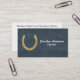 An illustration of a gold coloured horseshoe on a dark blue denim background with a white lettering template, the reverse is black with white text. This is set up for a farrier but could be used for any equestrian business.