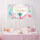 Sweet any age Alice in wonderland themed birthday banner for a girl's Alice in wonderland birthday party. This design features a large mad hatter's hat and various items from the story on a blue diamond pattern background.